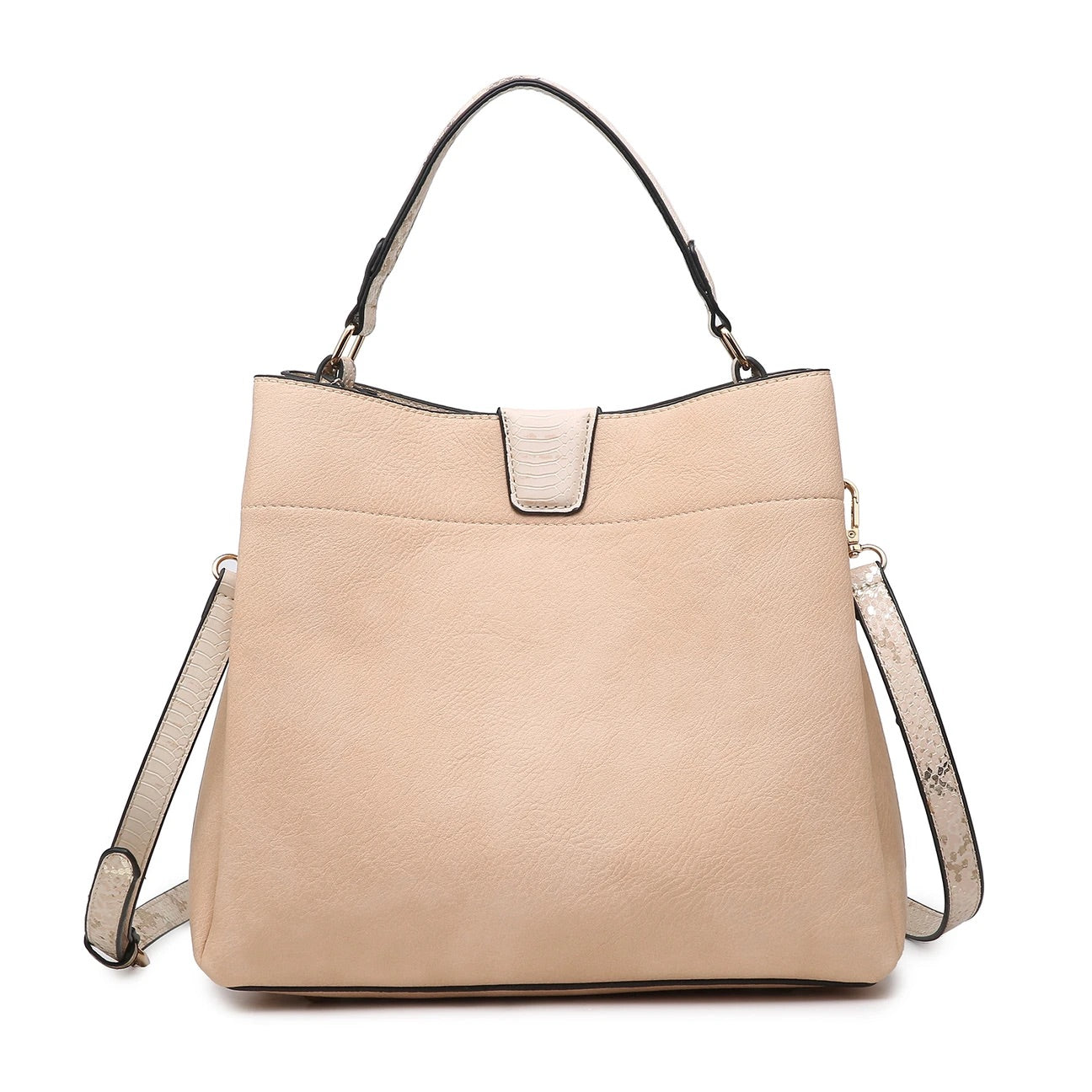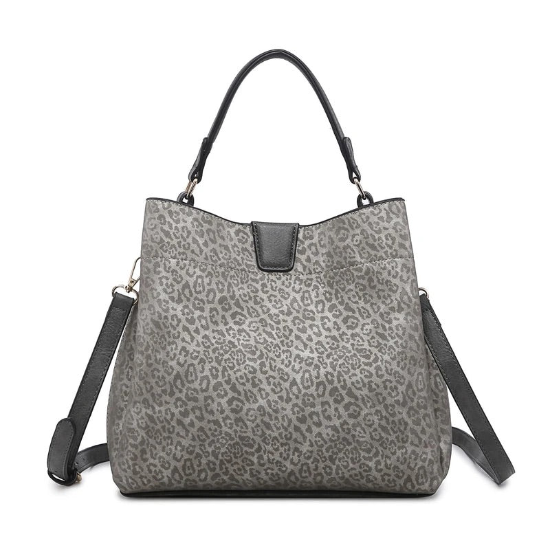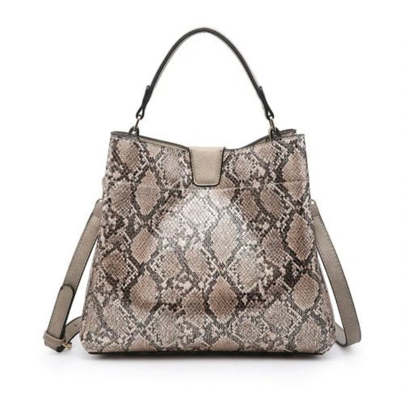 Includes two compartments with inner slip and zip pockets and a magnetic snap closure. An adjustable/detachable shoulder strap is included