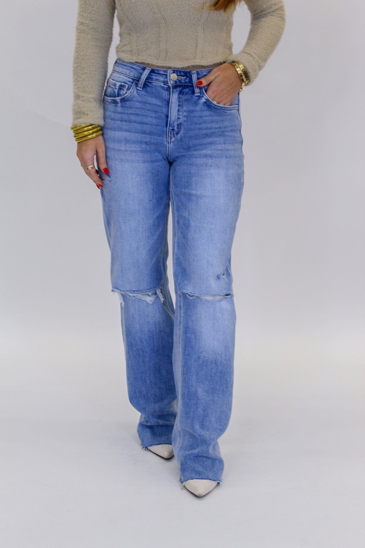 - Comfort stretch denim, high rise waist, distressed detail, raw hem, full length, wide leg jeans