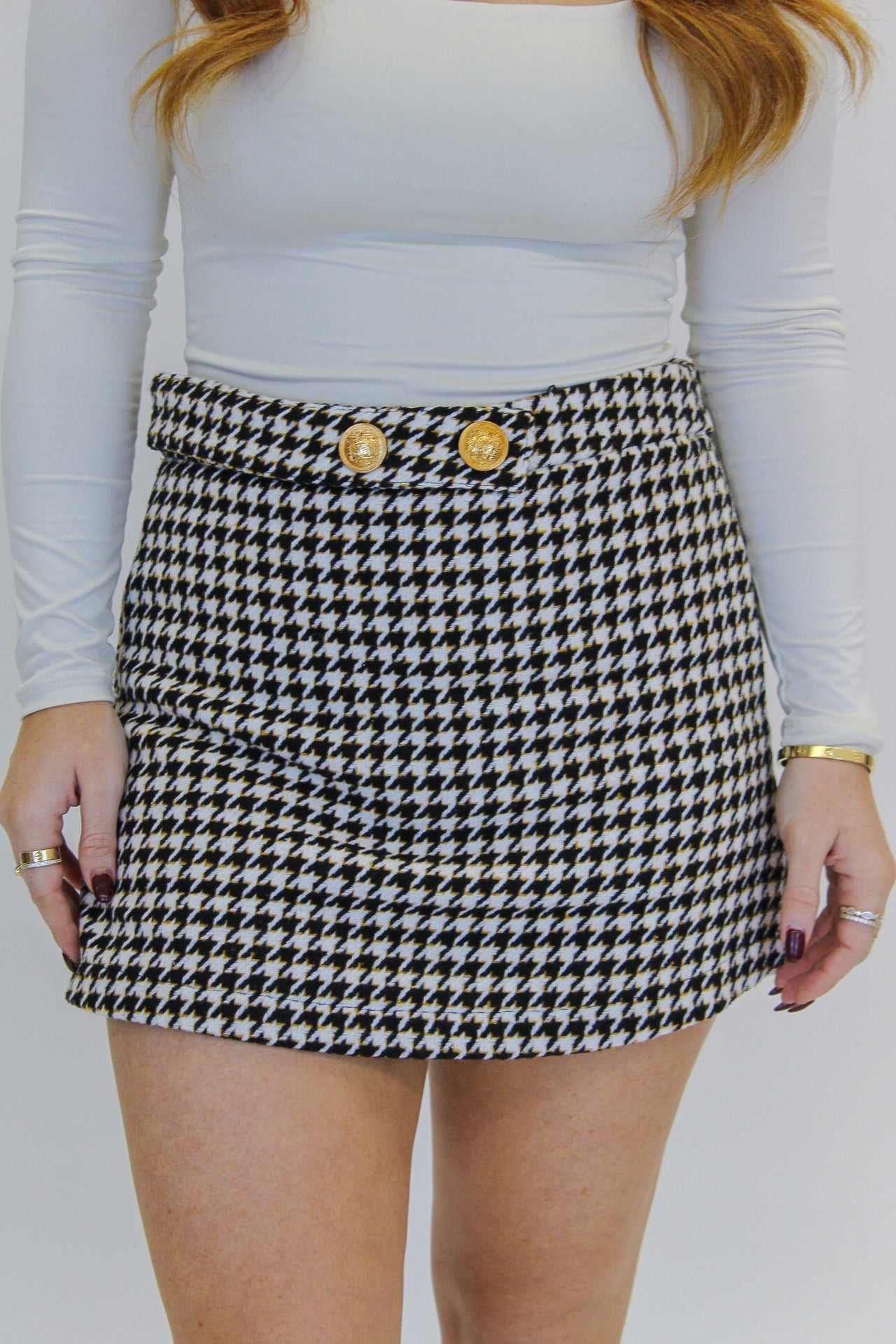 - Enhance your feminine style with our Legally Houndstooth Belted Skort. This girly girl skirt can be paired with a variety of tops and knee-high boots for a chic and sophisticated look. Embrace luxury and elegance with this timeless piece.