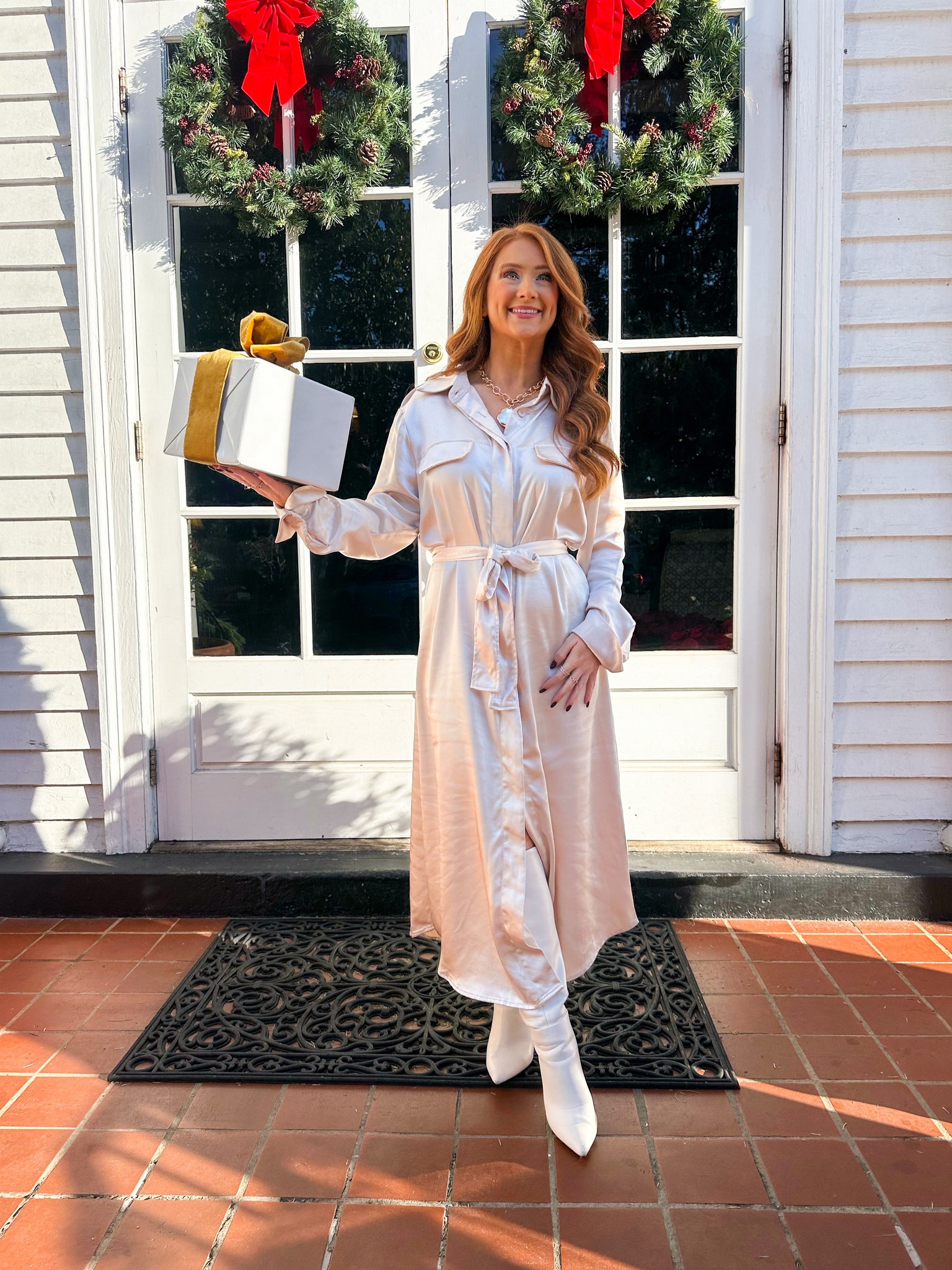 Elevate your style with our CHEERS Satin Belted Midi Dress in Champagne. Perfect for any holiday party or social event, this dress can be paired with boots or heels for a versatile and chic look. Its luxurious satin fabric and belted waist will make you stand out with sophisticated elegance.