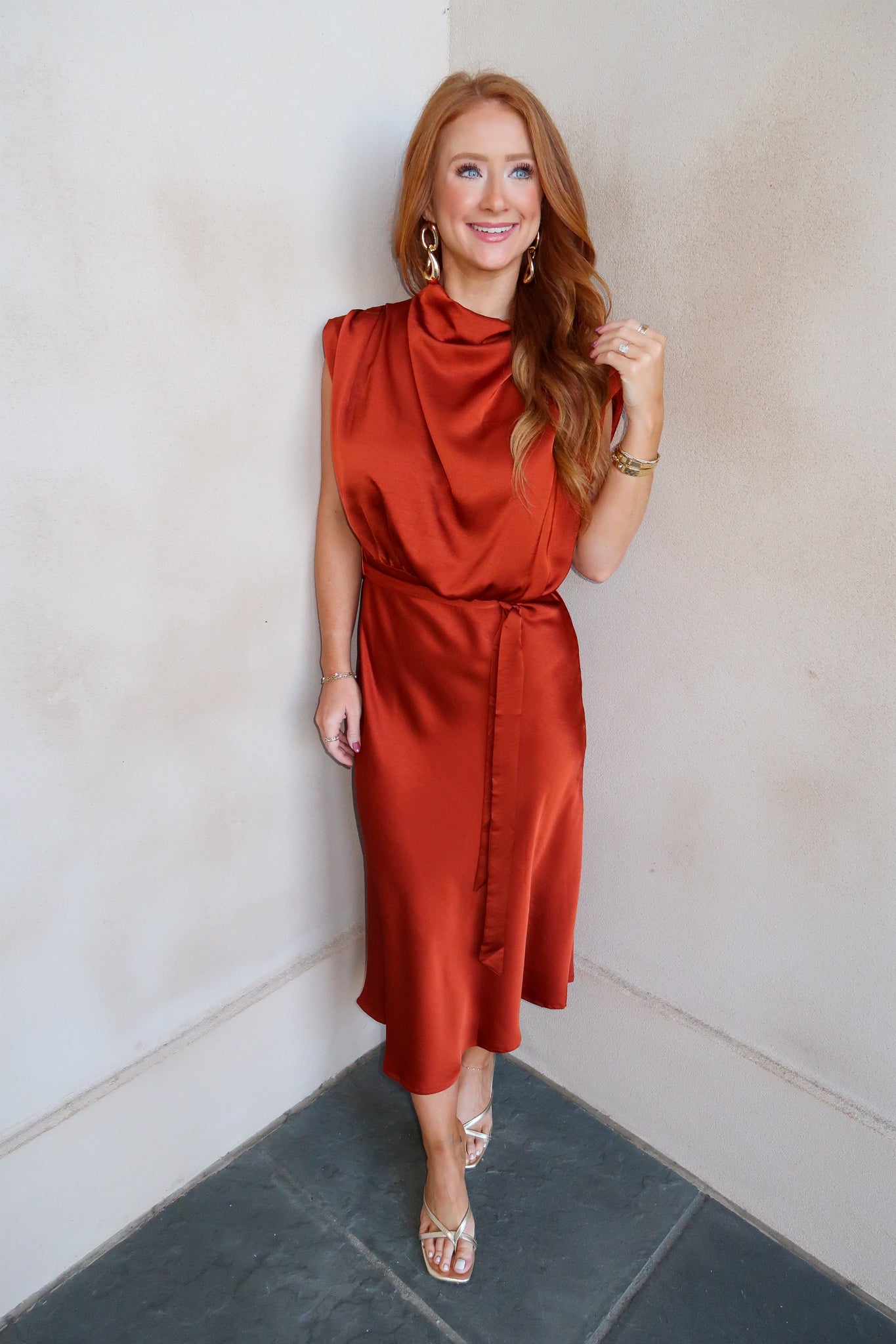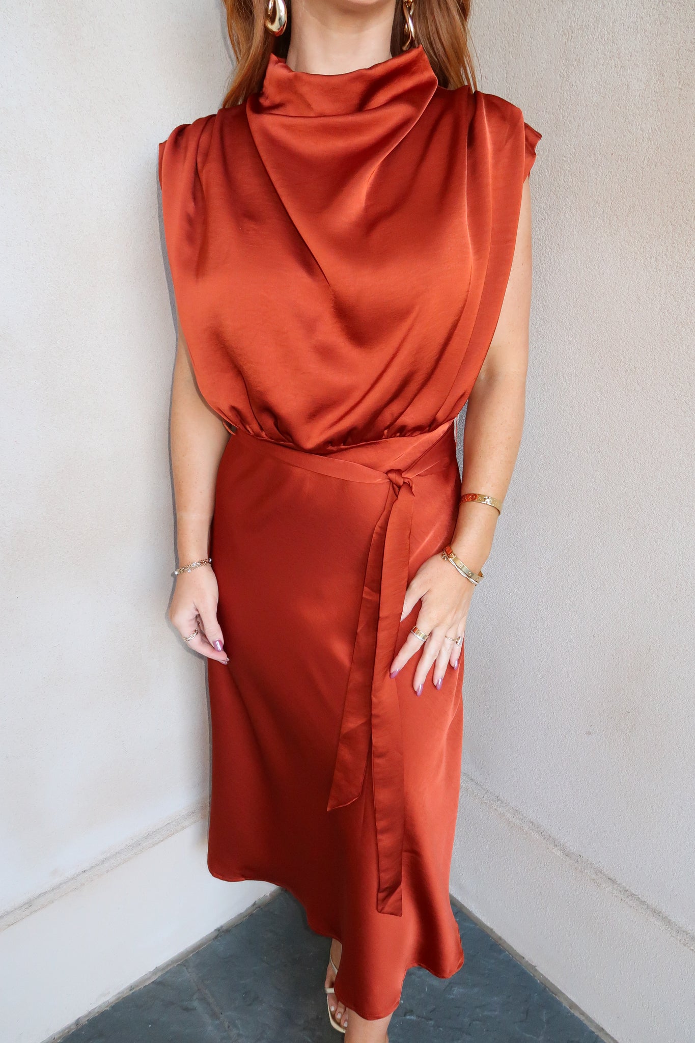 Elevate your wardrobe with the Cindy Cowl Midi Dress in a warm rust hue. This timeless piece features a graceful midi length and a flattering cowl neckline, making it perfect for work, church, or as a stylish choice for a wedding guest. Its elegant silhouette offers both comfort and class, ensuring you make a sophisticated impression at any occasion.