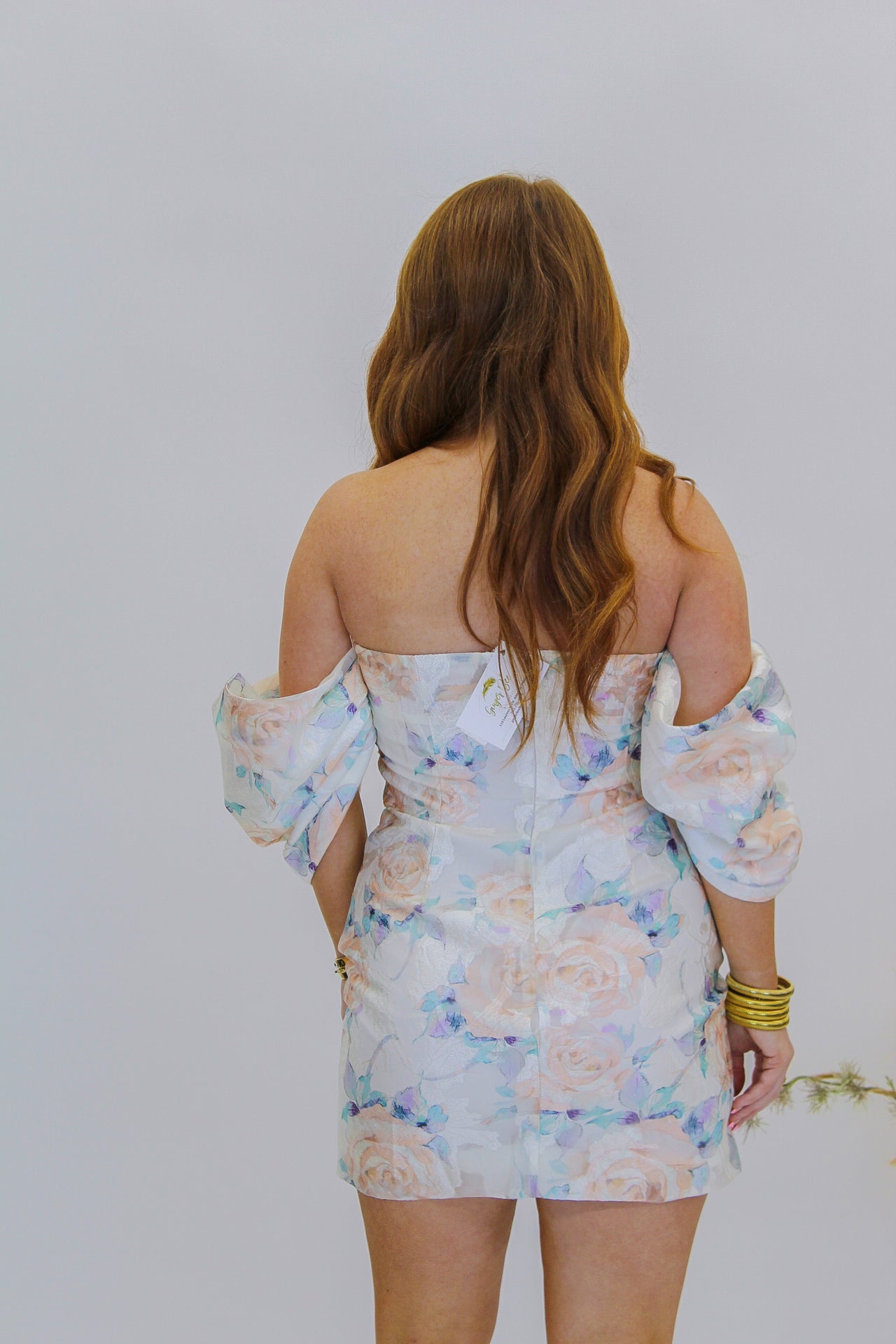Indulge in timeless elegance with our Classic Chic Off Shoulder Floral Mini Dress in cream. This dress features a delicate floral print, perfect for spring steeplechase or a bridal shower. Its off shoulder design adds a touch of sophistication to your wardrobe. Elevate your style with this must-have piece.