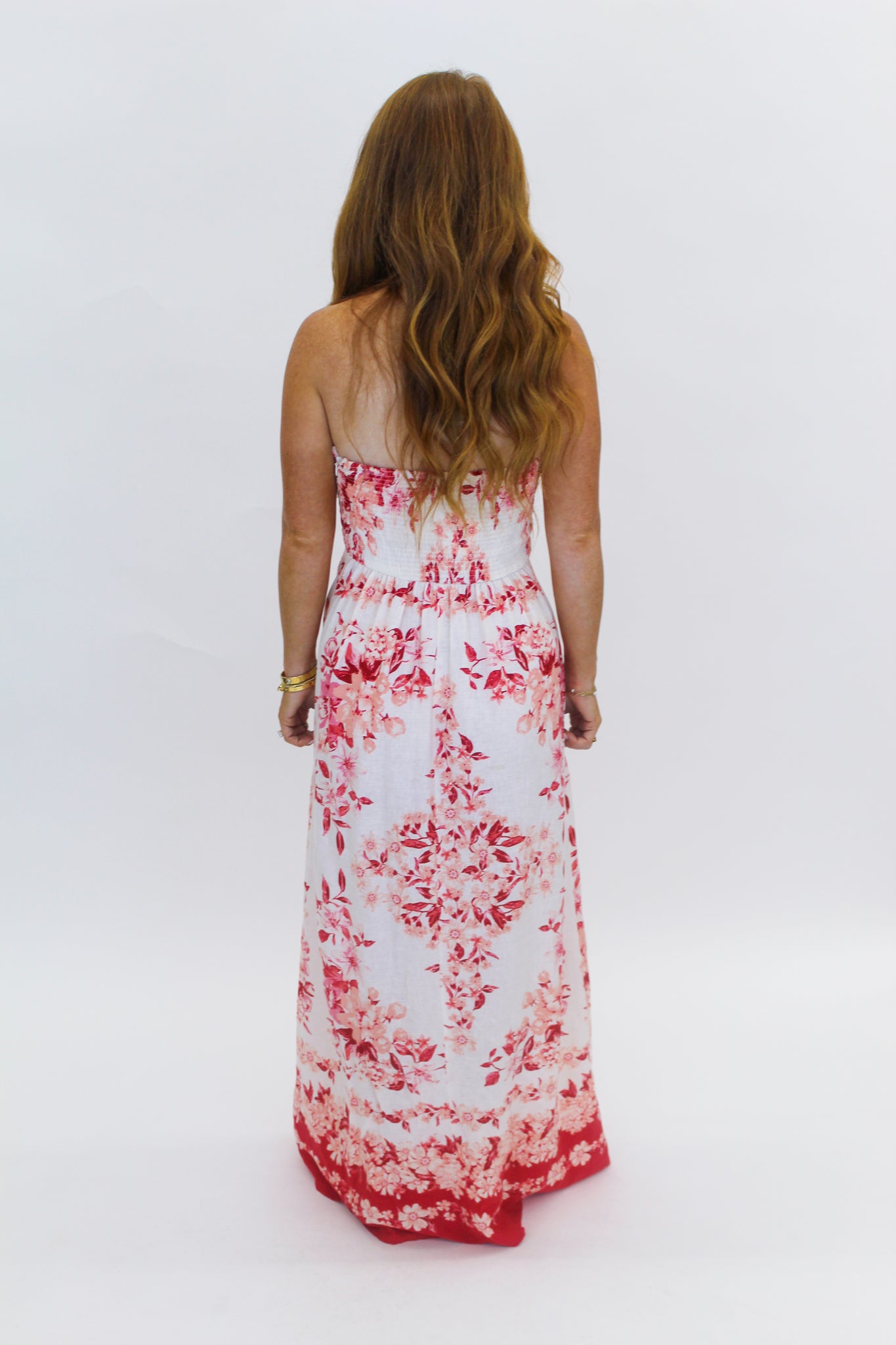 The Daphne Floral Strapless Midi Dress offers a refined silhouette perfect for warm-weather occasions. Its vibrant pops of color bring a fresh, elegant touch to your summer wardrobe. Pair it effortlessly with sandals or wedges to complete a sophisticated, breezy look that transitions seamlessly from day to evening.