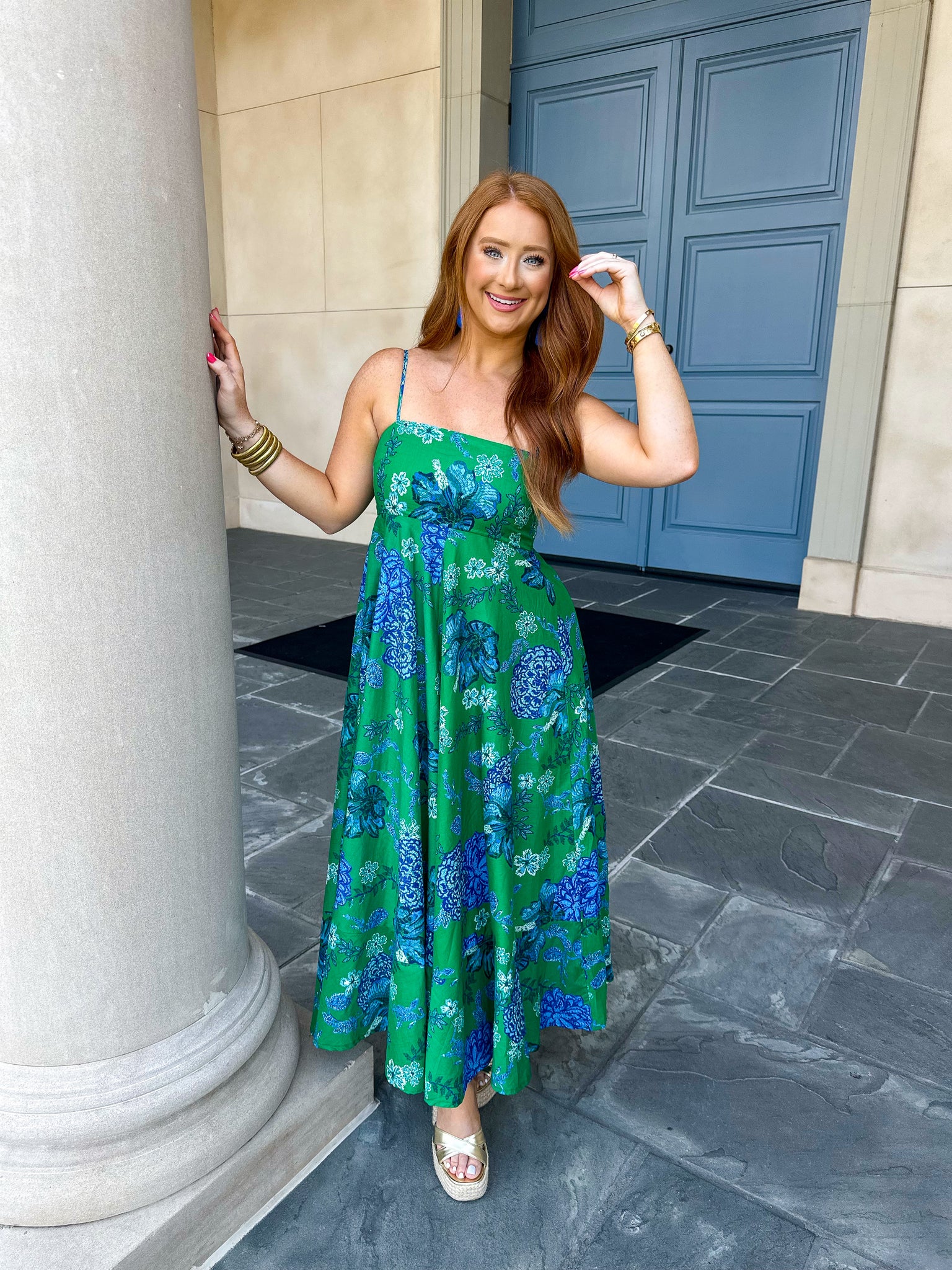Elevate your wardrobe with our Remi Floral Midi Dress-Green Blue. This elegant and versatile dress features a fun floral print and can be effortlessly dressed up or down with sandals or wedges. Perfect for any occasion, from everyday wear to special events. Embrace sophistication and style with this luxurious piece.