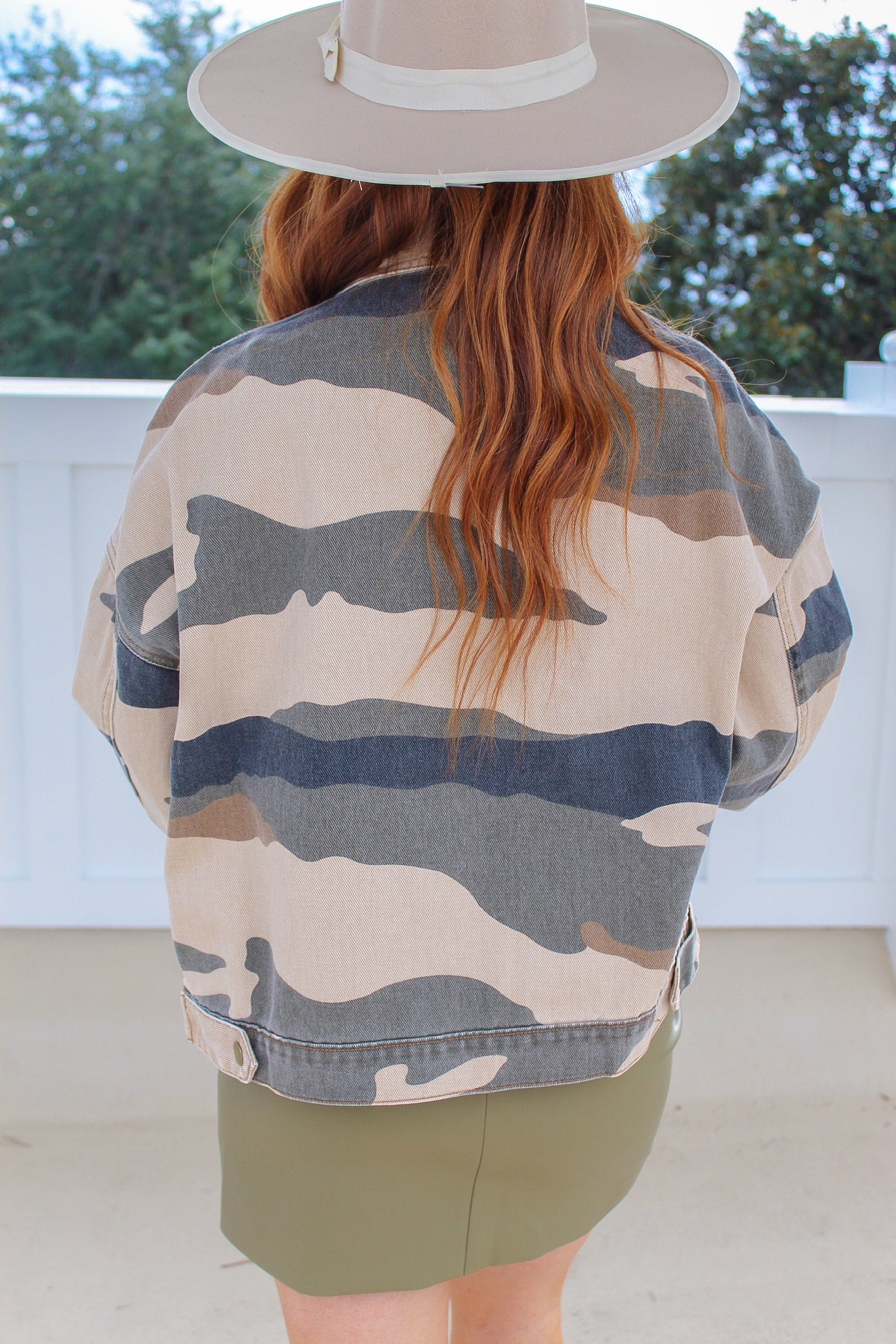 • This camo jacket is so trendy and is a great addition to your closet. Its great for a colder day and your wanting to layer up. Would be super cute paired with a black jumpsuit.