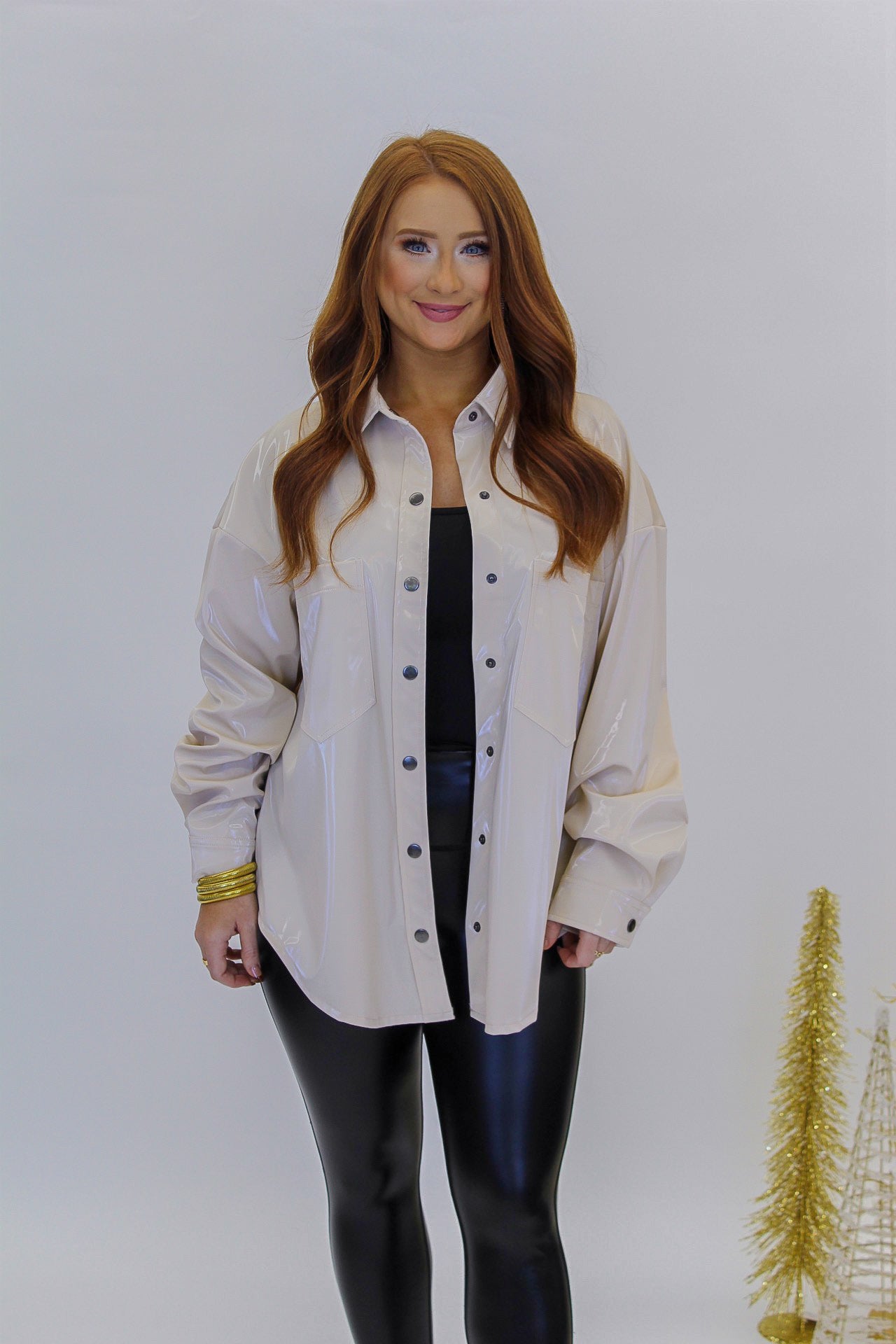A patent faux leather shacket to have in your closet for forever! The perfect statement piece to top off any outfit!