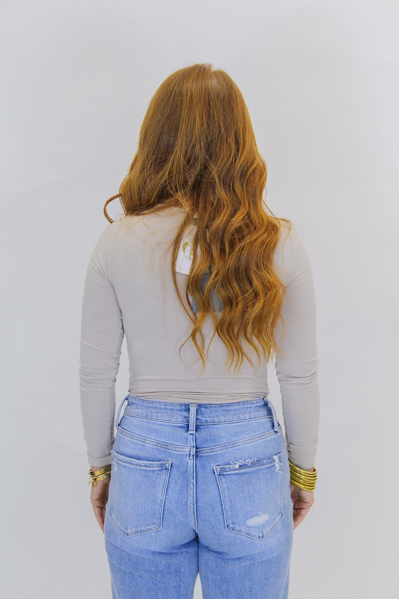 Presenting the Emma Shirring Knit Top in Taupe. This elevated basic boasts unparalleled luxury and great quality, perfect for pairing with any type of bottom. Elevate your wardrobe with this sophisticated and exclusive piece.