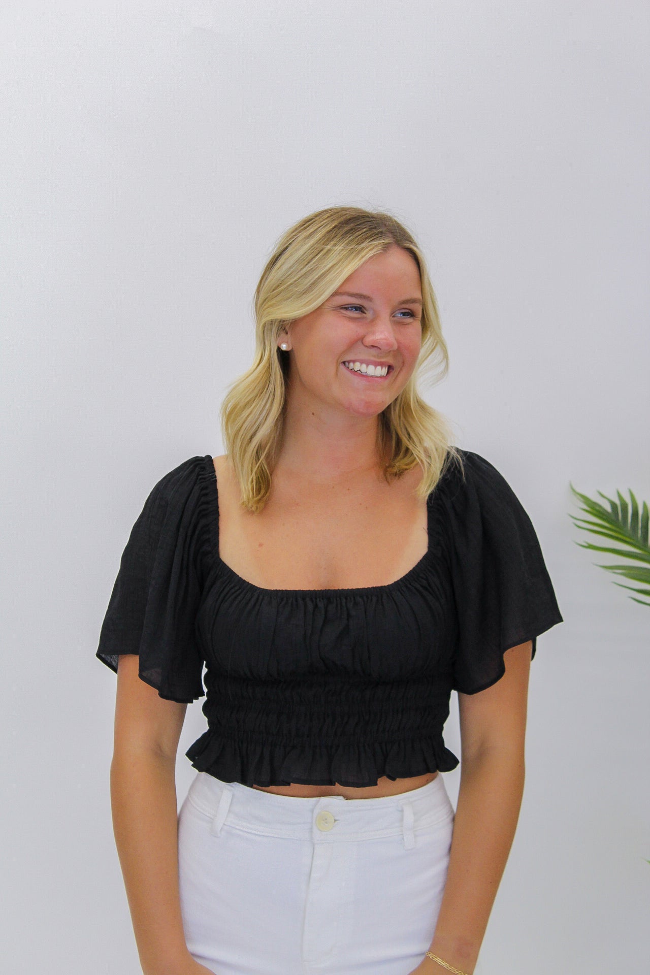 Indulge in the finest luxurious fashion with our Flirty Flutter Sleeve Lace Up Top. This timeless top is a must-have for any wardrobe, perfect for a night out and effortlessly pairs with your favorite bottoms. - Flutter Sleeves