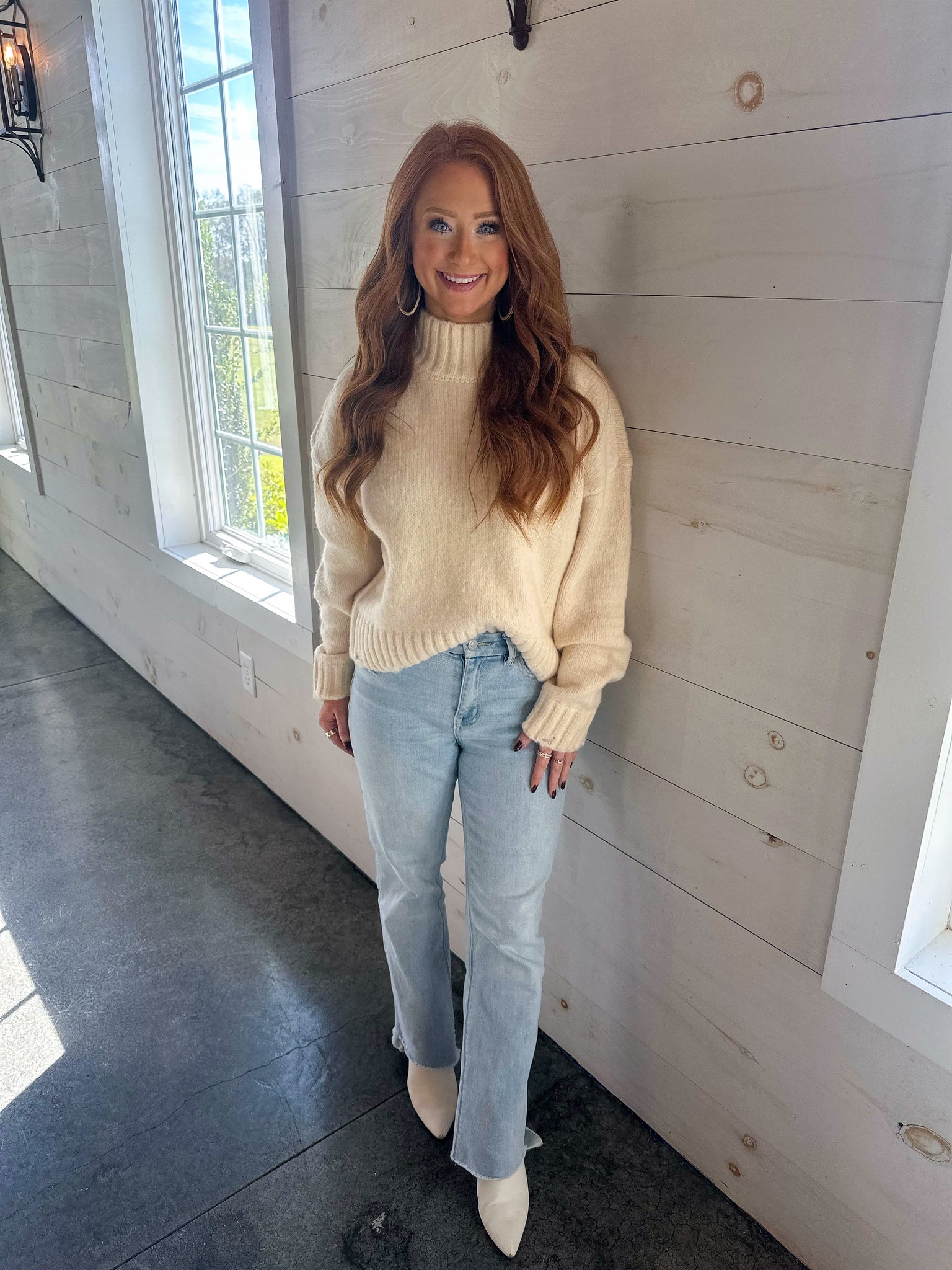 Elevate your wardrobe with our Lizzie Mock Neck Sweater in Blue. The soft mock neck adds a touch of sophistication to any outfit, perfect for pairing with jeans or leather bottoms. Stay cozy and stylish this season.