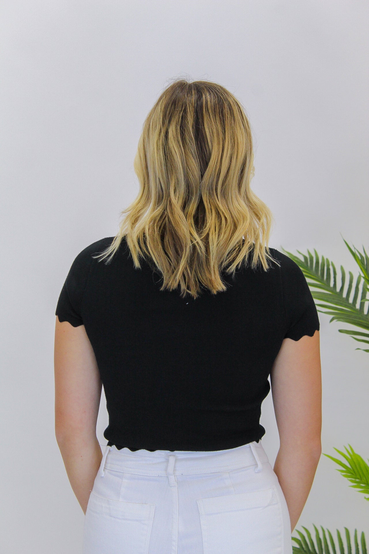 Indulge in luxury with the Tyra Scalloped Edge Top.. This top features a playful and versatile design, perfect for pairing with all your favorite bottoms. Elevate your wardrobe with this elegant and fun basic top.