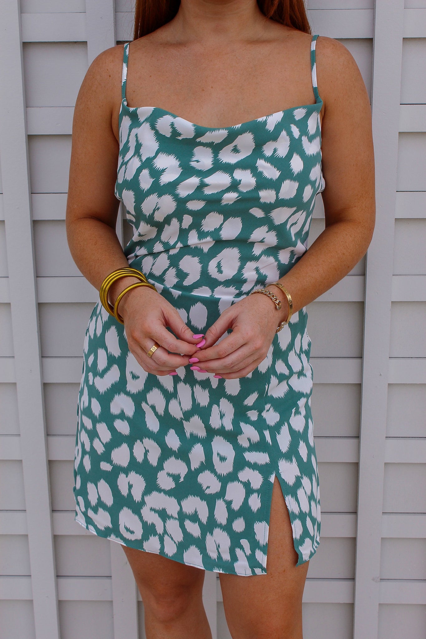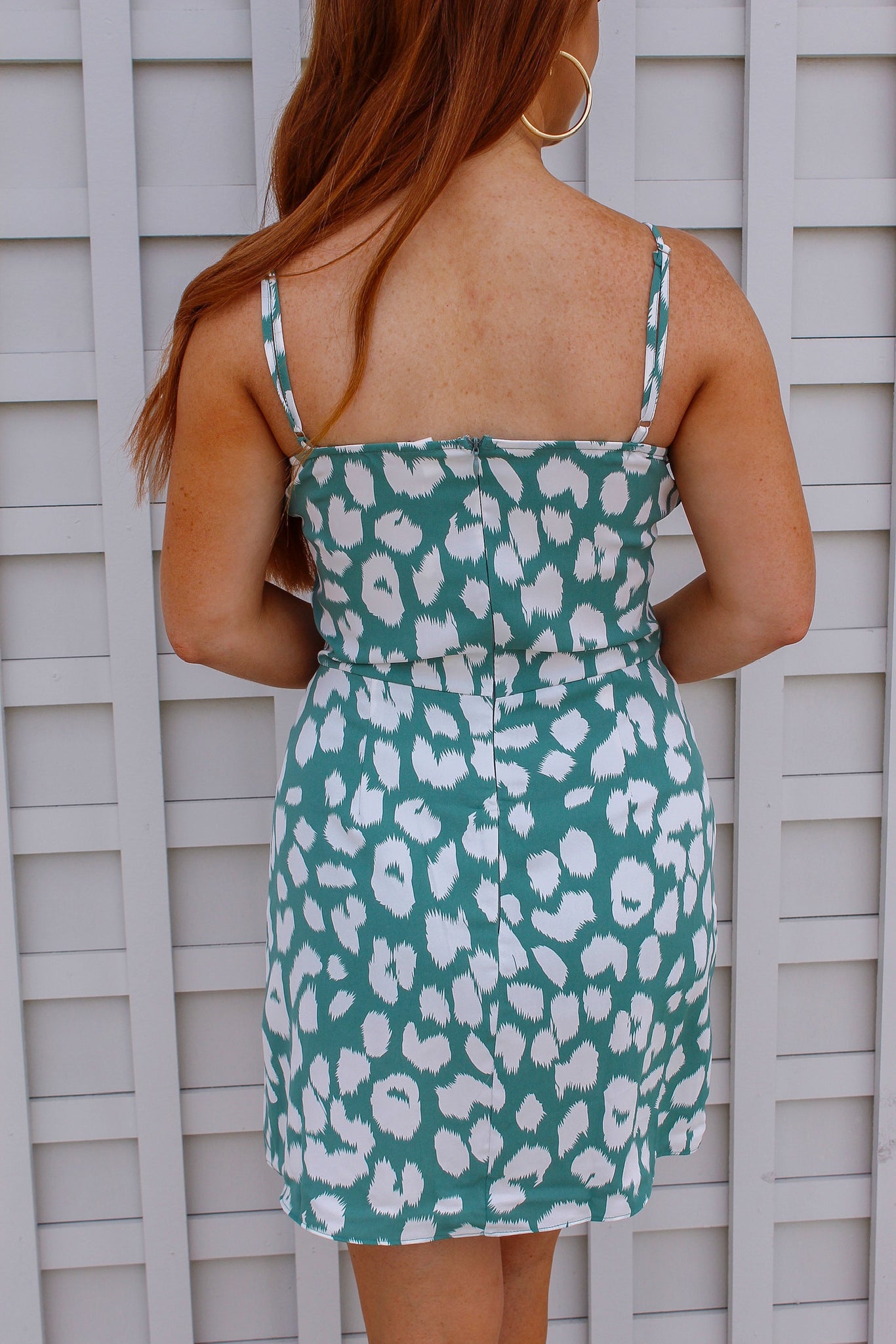 This aqua patterned dress is perfect for whatever you have coming up this summer!! Such a flattering fit for a wedding or date night!