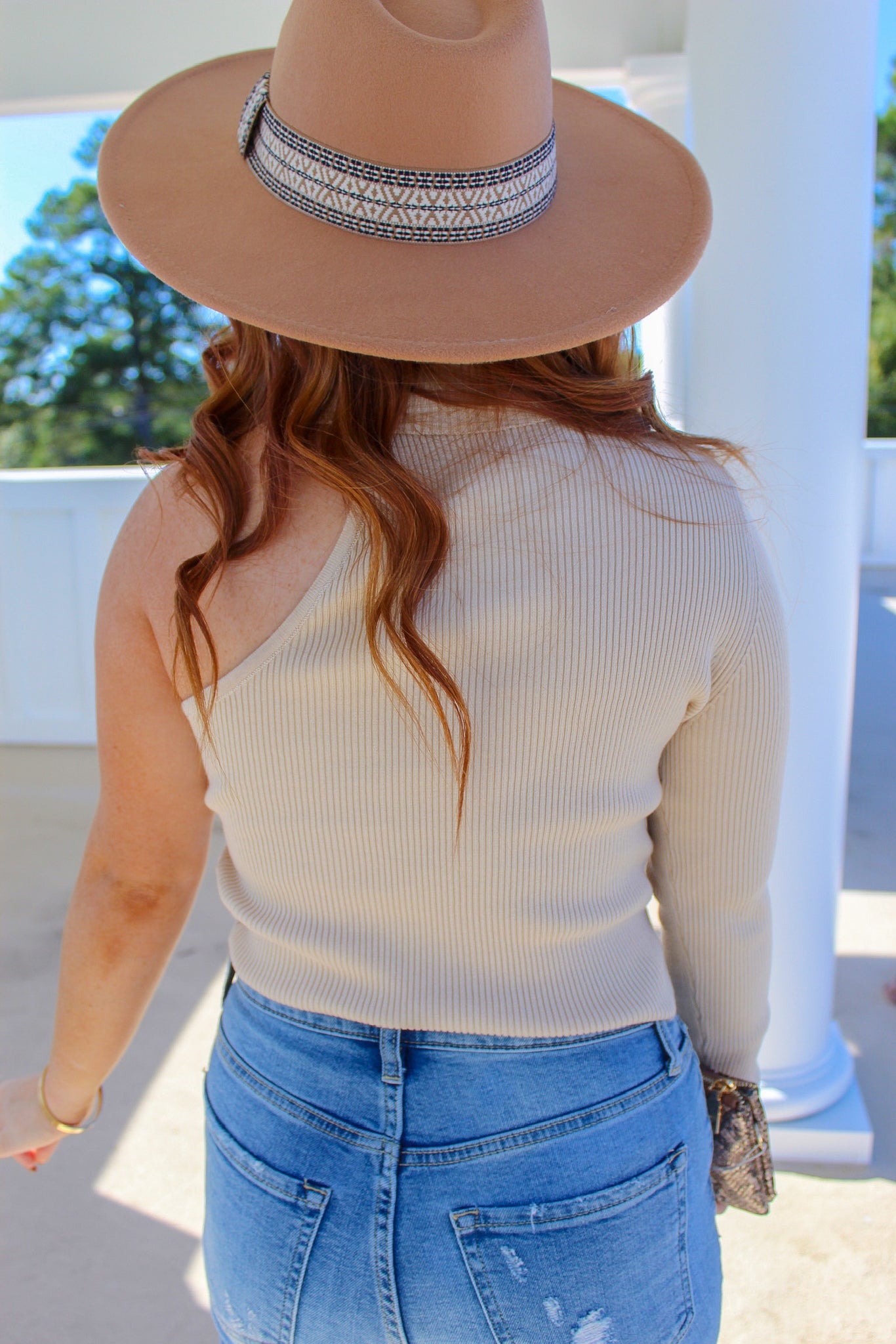 One of our best sellers! This beige one sleeve sweater is one you can pair with literally anything!