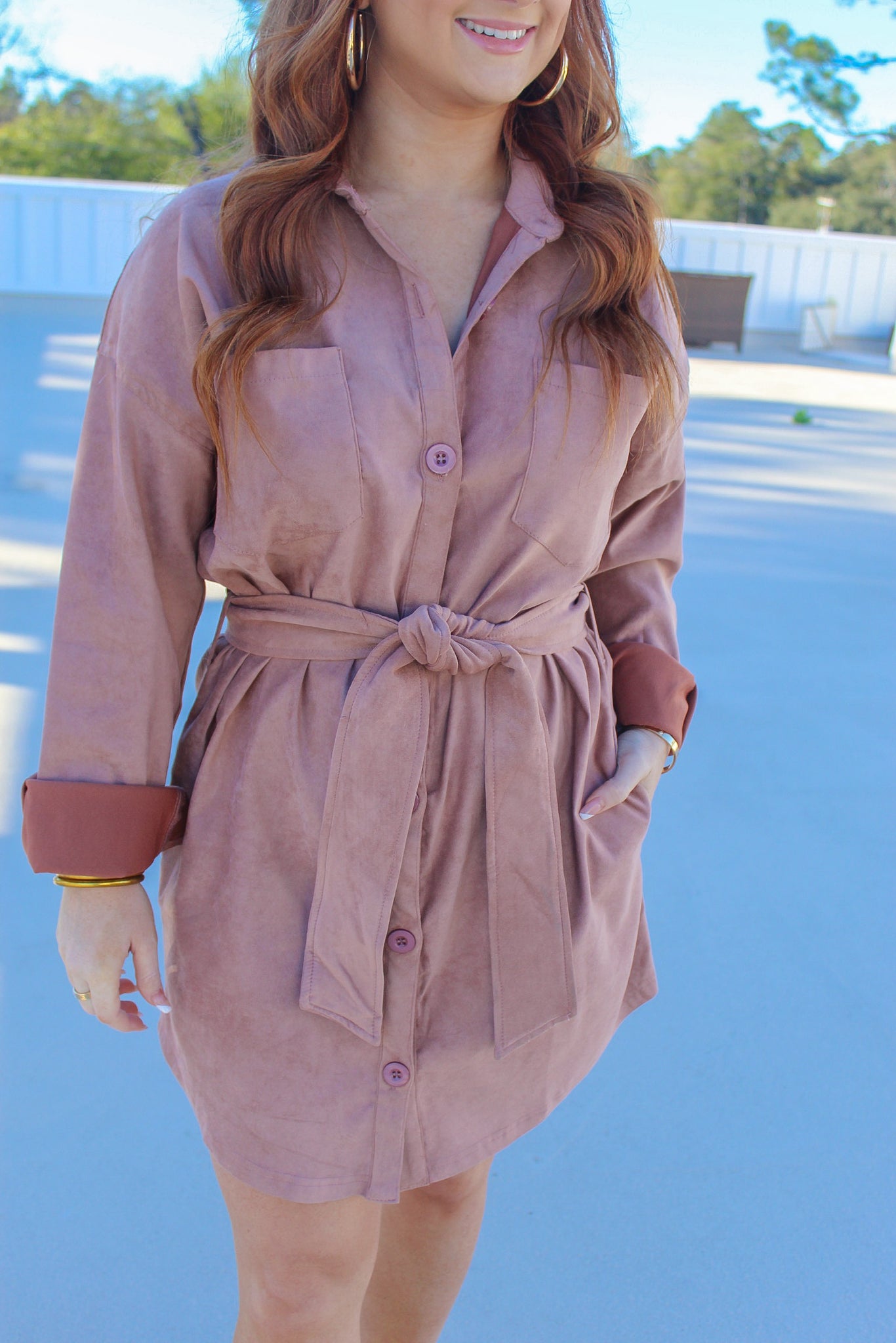 Cara Waist Tie Suede Shirt Dress- Mauve