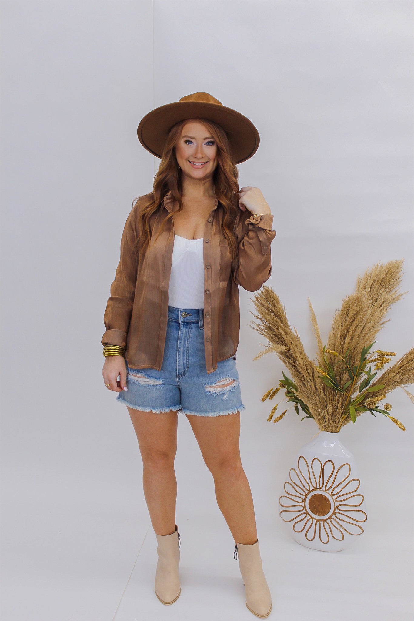 • This brown sheer button up is one to put you on trend. Pair with a cami or graphic tee underneath for such a novelty look! The color of this top is everything!