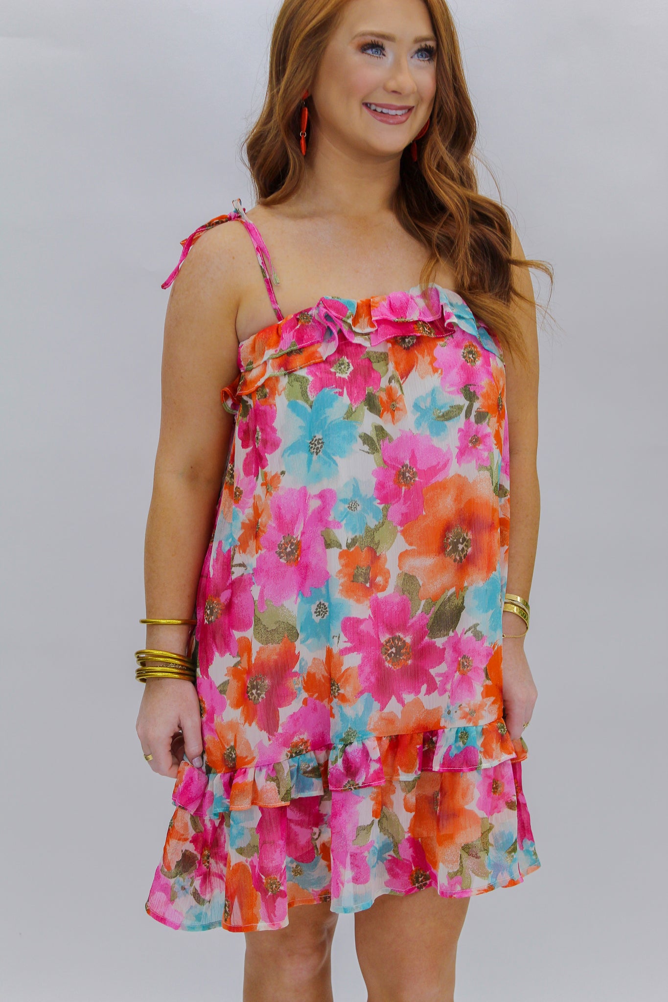 The colors in this dress are sooo stunning! This dress is great for an hot summer day or vacation! Can be dressed up with wedges or dressed down with white sneakers!