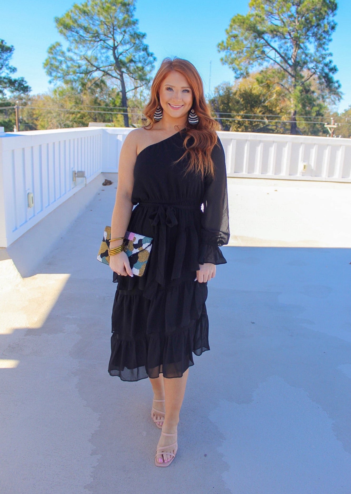 • Load image into Gallery viewer, Karson One Shoulder Ruffle Midi Dress- Black