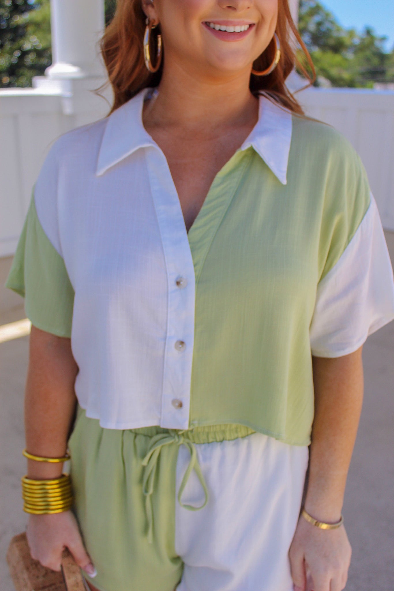 Key Lime Short Sleeve Contrast Top- Sage/White
