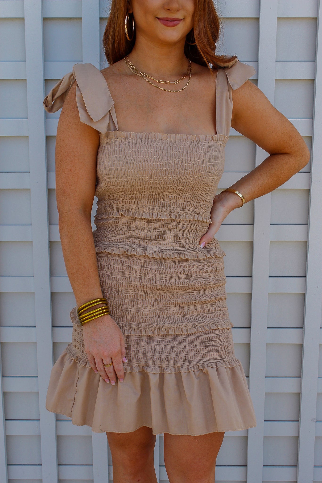 Larissa Tie Smocked Dress- Sand