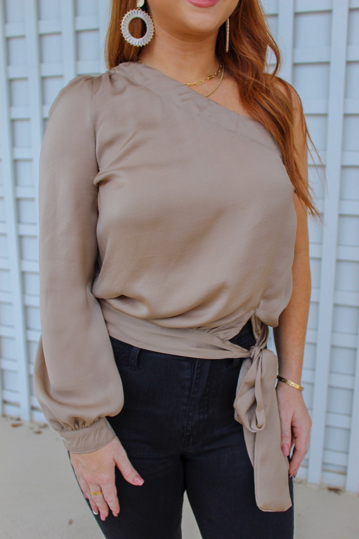 • Load image into Gallery viewer, Layla One Shoulder Tie Blouse- Taupe