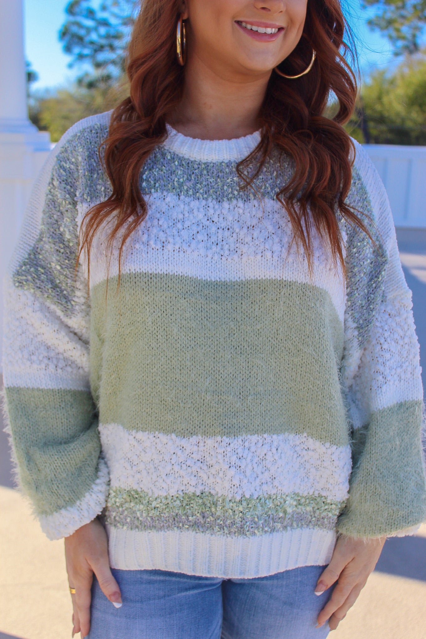 This sweater is perfect to carry into a cooler spring! This sage color stripe detail is so pretty!
