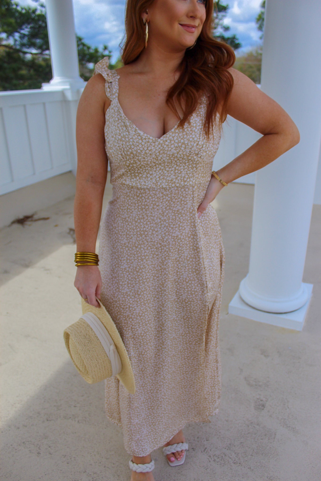 This floral midi dress is one you want all spring and summer long! Easy to pair with sneakers for a brunch outfit, or with wedges for an date night!