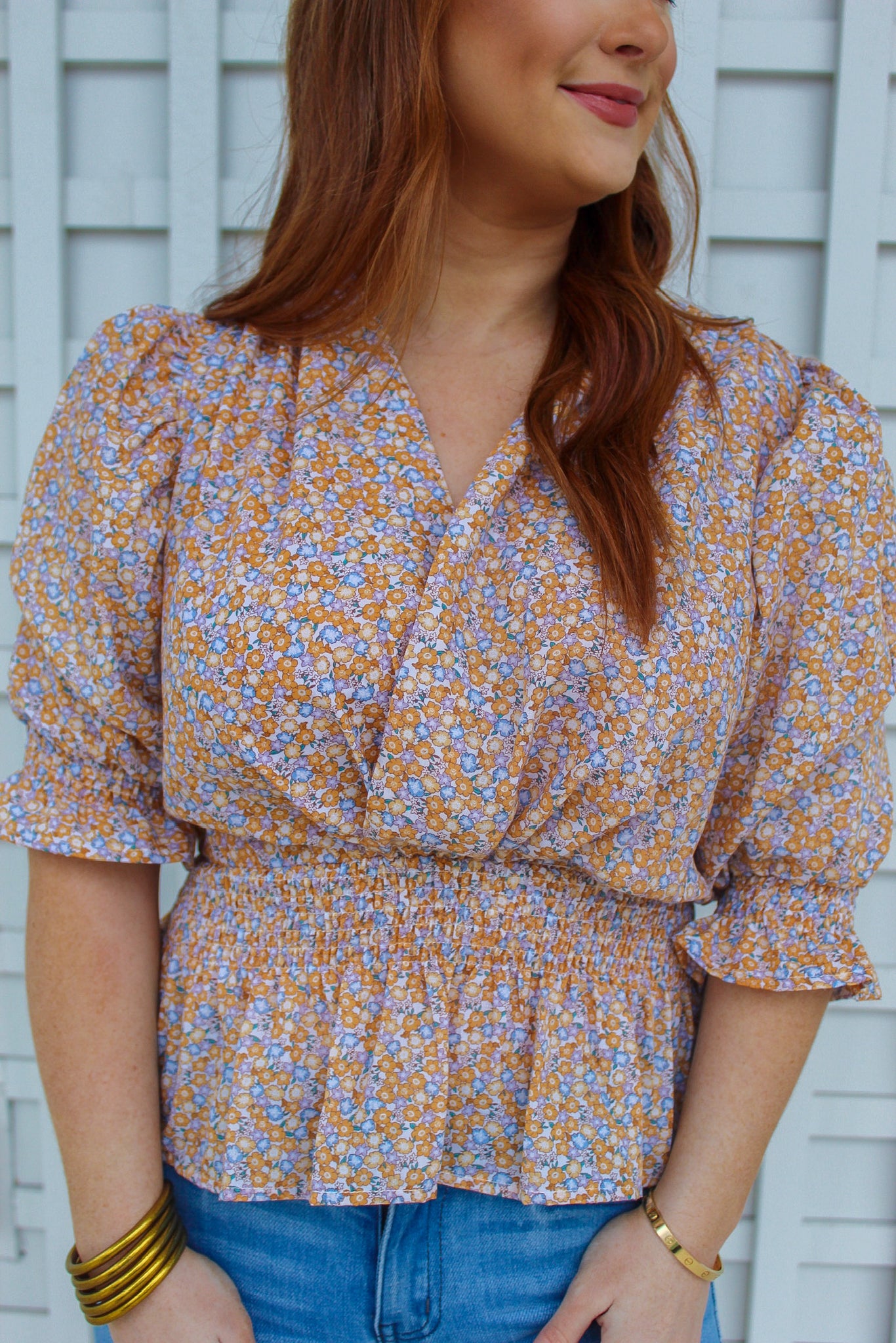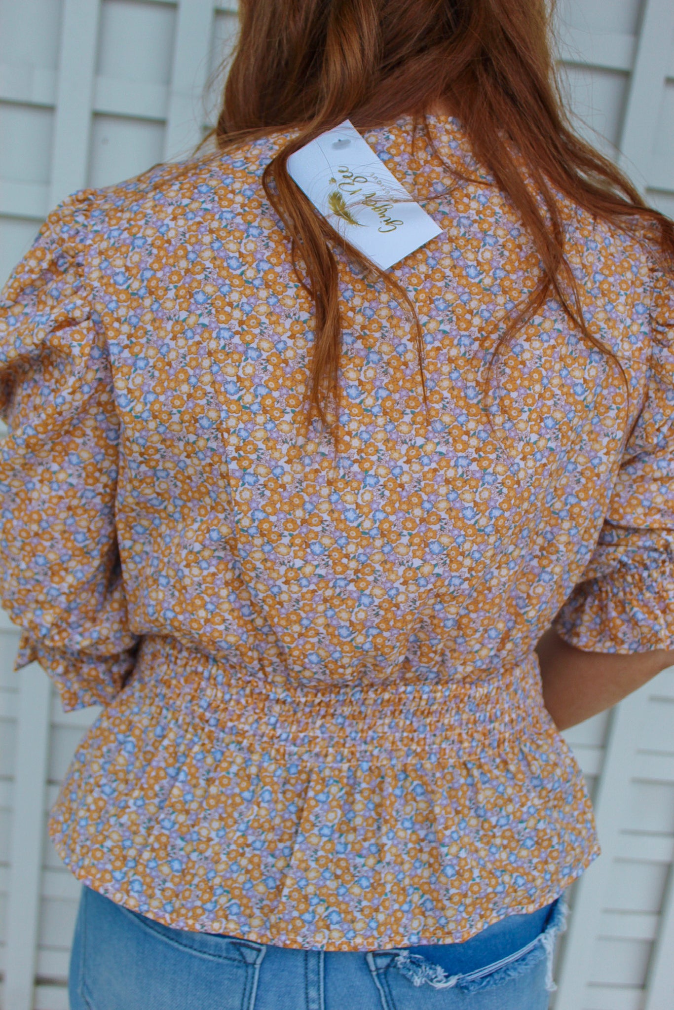 This fun floral blouse is perfect to pair with jeans for an easy spring look! Pair with a hat for such a cute outfit!