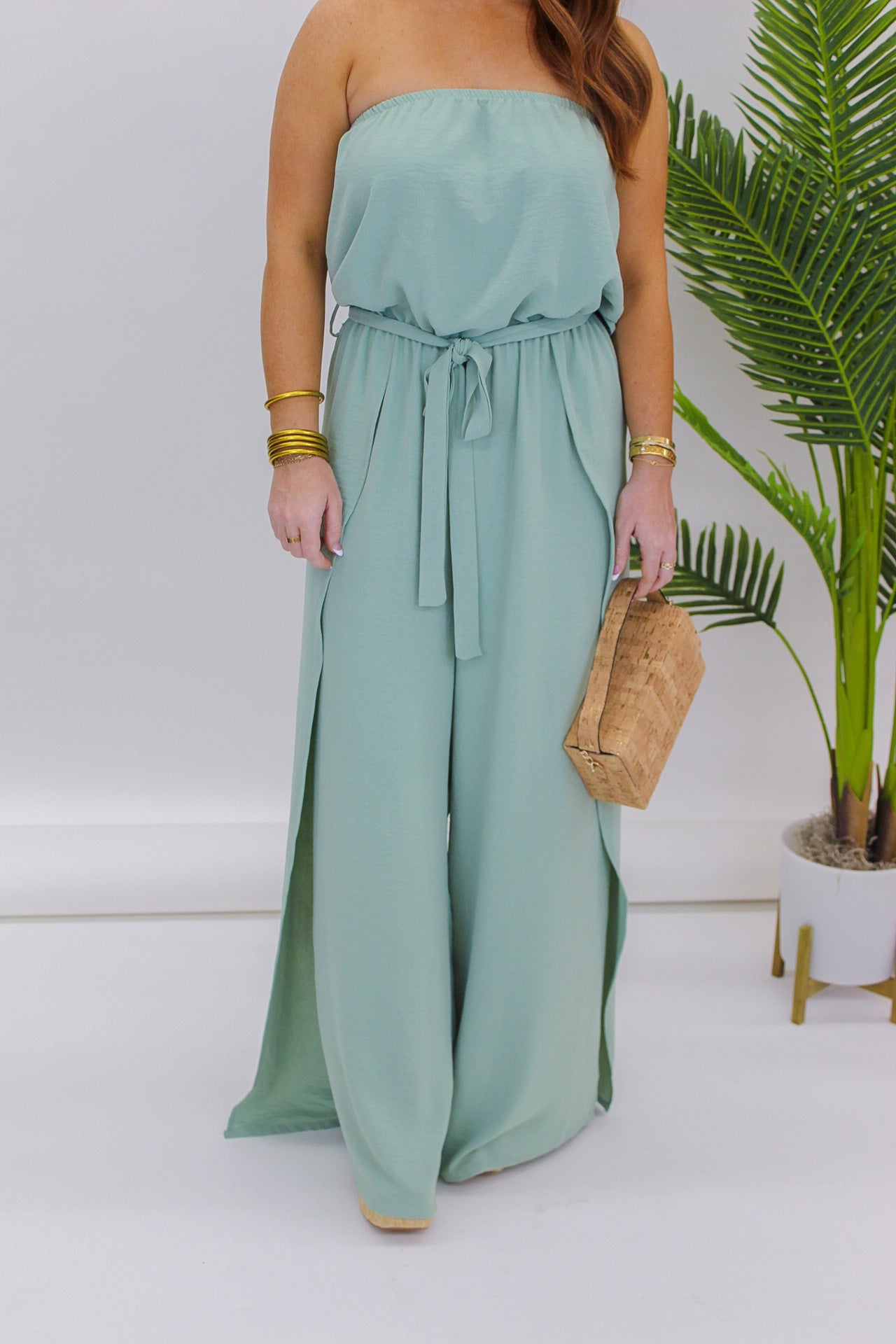 Pick Me Tie Front Strapless Jumpsuit- Sage