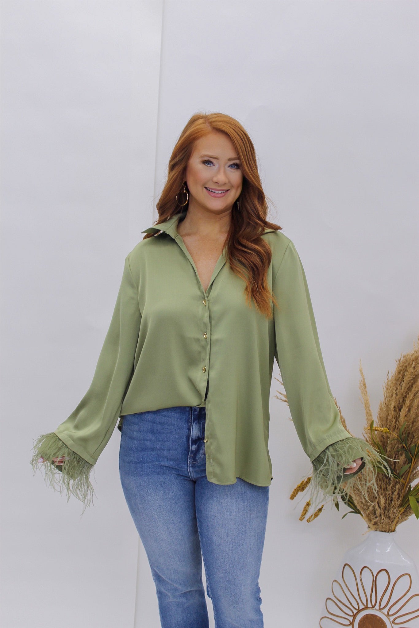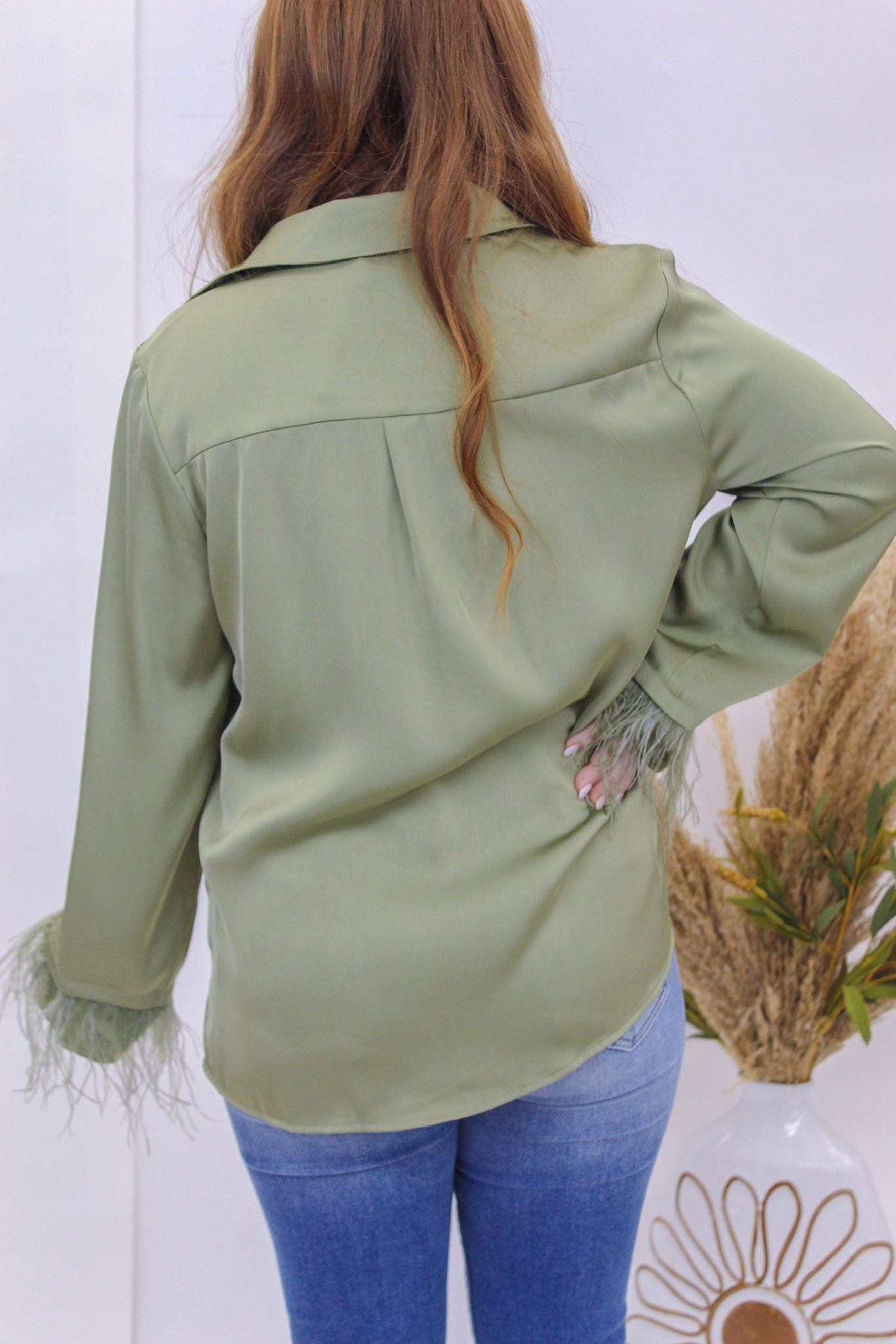 • Load image into Gallery viewer, Power Love Button Up Feather Detail Sleeve- Olive