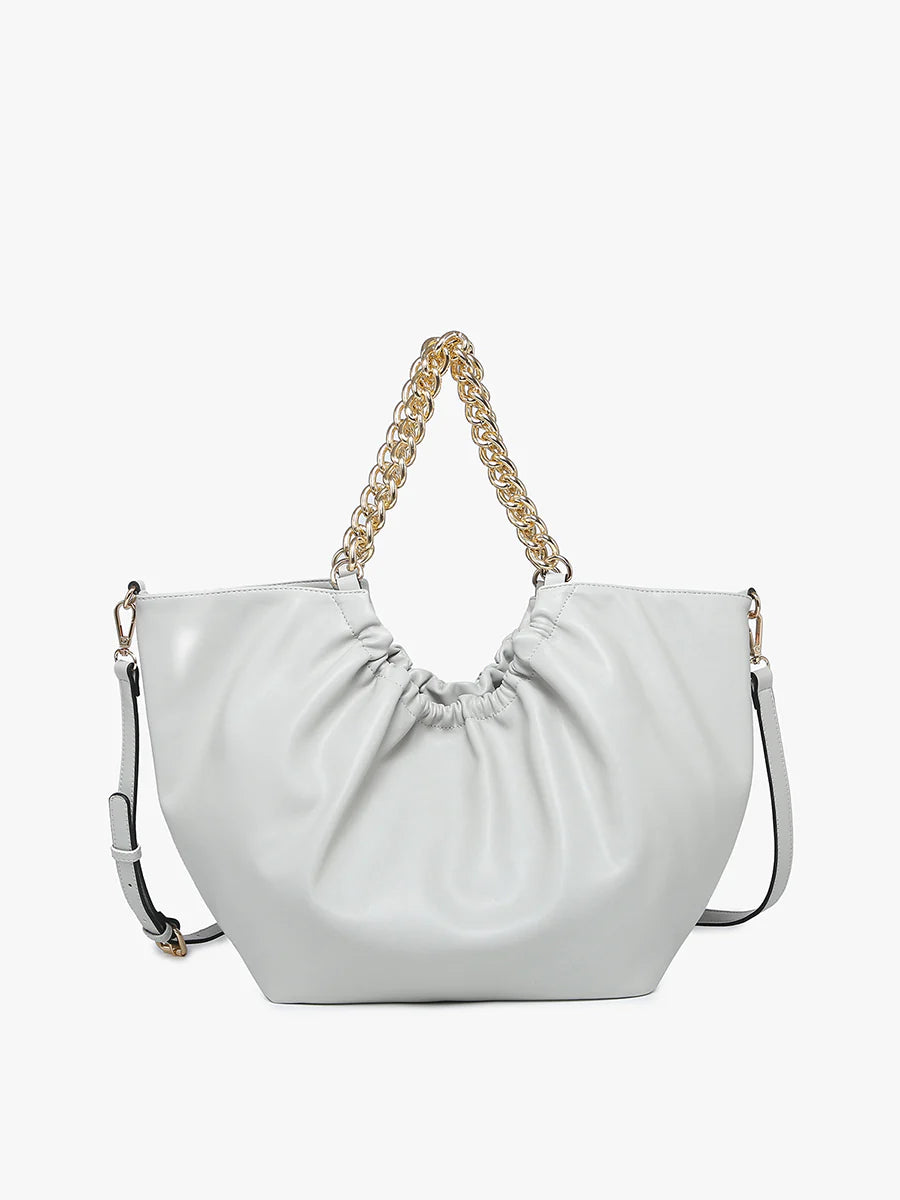 Embrace effortless style with Stassi, the epitome of laid-back sophistication. This large tote is designed for convenience with its snappy 3-point opening and elegant chain handles, exuding charm wherever you go. Need versatility for your cross-town adventures? Simply sling on the adjustable crossbody strap and strut in style with Stassi by your side. Inside, Stassi features a lined interior complete with slip and zip pockets, keeping your essentials organized and within reach.