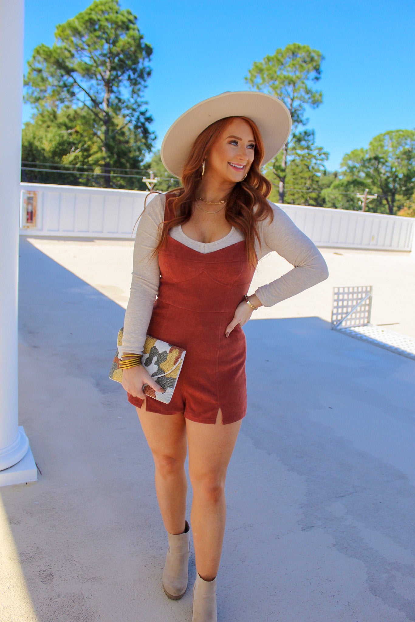 This suede romper is the perfect outfit for thanksgiving day! Pair with the "Carly Rib Knit Ruched Crop Top-Oatmeal" for an warmer option!
